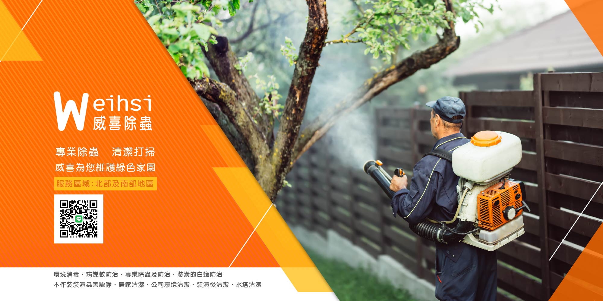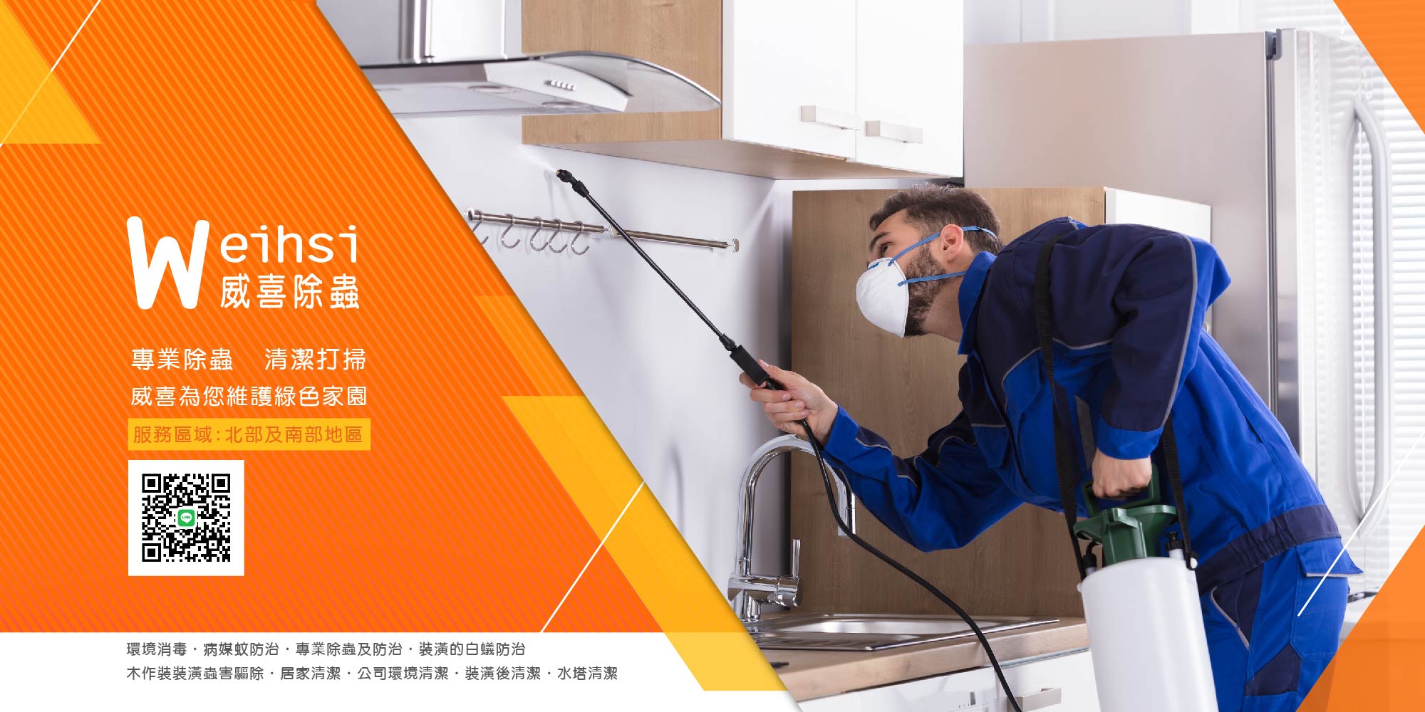 威喜除蟲公司是一間專業的消毒除蟲公司,主要解決客戶環境 衛生的改善,秉持著認真、負責、服務、合理價格的經營理念 ,以環保、低毒、施工保固,以最嚴謹的態度提供客戶最優質 的服務品質與態度。